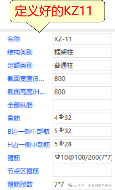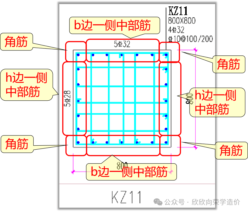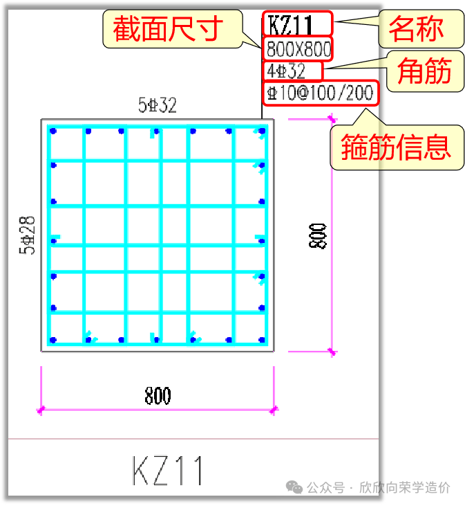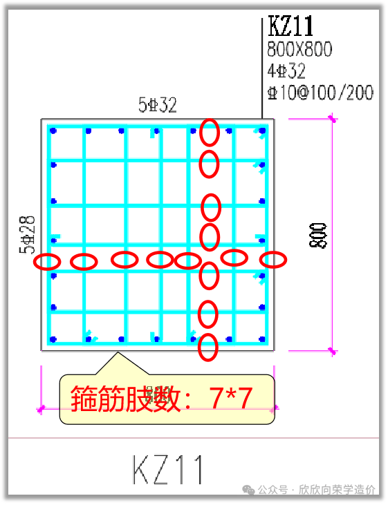 上面这两种柱截面标注没有区别,道理都是相同的。下面我们就以一根KZ11为例看一下钢筋信息,如图6所示。
