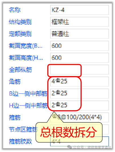 这个截面标注和上面的有什么区别呢?在之前的文章中都讲过,如果柱子的纵筋都是一种信息,可以标注总根数,那这种在软件里如何定义呢?虽然图纸的是总根数,但我们定义的时候也要分开,先看一下图纸的拆分情况,如图11所示。