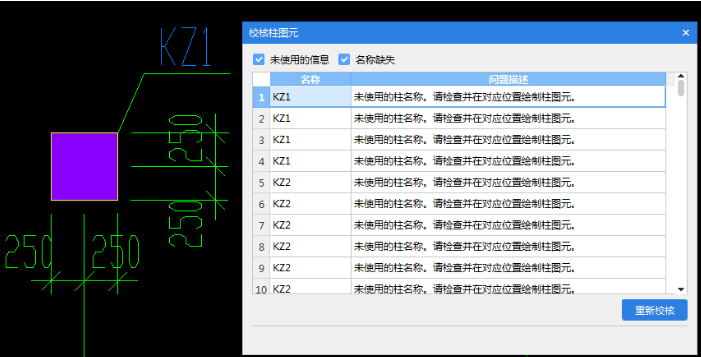 (1)在“识别柱”后,自动进行柱图元校核,弹出“校核柱图元”窗体,或单击“建模”➤“校核柱图元”,软件识别的柱图元和原CAD图标识进行校核,如果存在无名称标识、有名称标识但尺寸匹配错误的,则弹出如下提示;