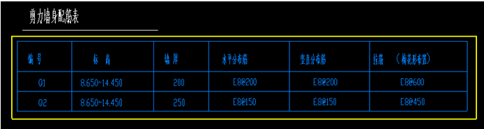 (1) 单击选项卡“建模”➤“识别剪力墙”➤“识别墙表”,,拉框选择柱表中的数据,如下图所示黄色线框为框选的柱表范围,按右键确认选择;