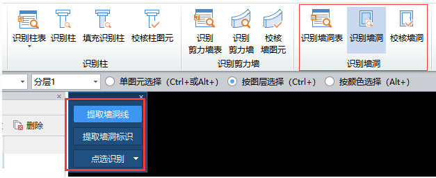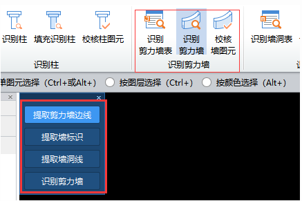 操作步骤:(1)单击“建模”➤“识别剪力墙”➤“提取剪力墙边线”,利用“单图元选择”、“按图层选择(Ctrl+)”或“按颜色选择(Alt+)”功能选中需要提取的混凝土墙边线CAD图元;按软件下方提示,点击鼠标右键确认提取,则选择的墙边线CAD图元自动消失,并暂时存放在“已提取的CAD图层”中。