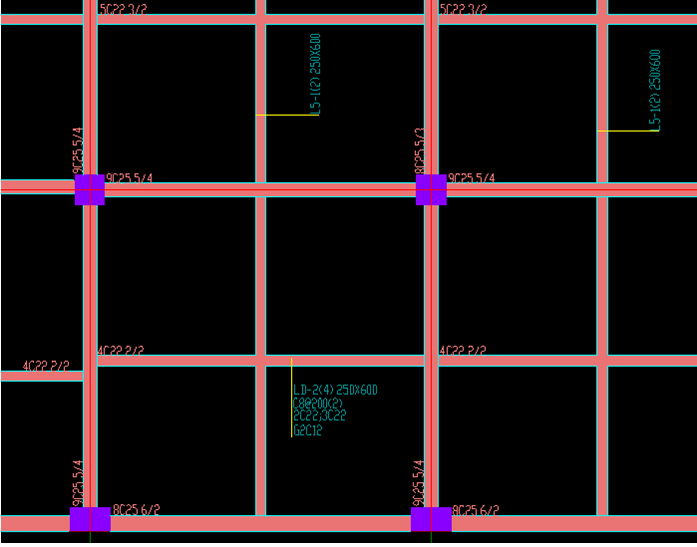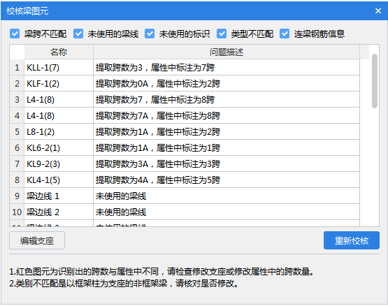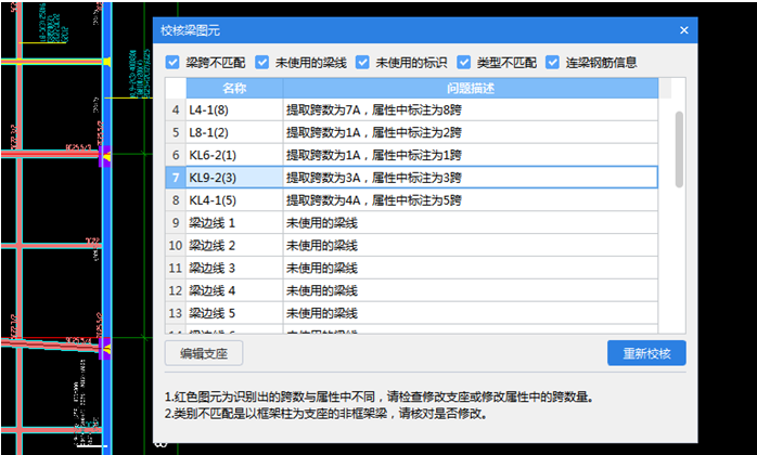 注意:梁跨校核只针对有跨信息的梁,手动绘制的没有跨信息的粉色梁不会进行校核。