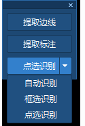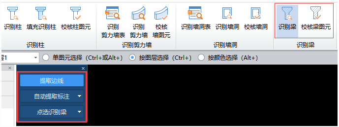 (3)完成提取梁边线和提取梁集中标注操作后,点击识别对话框“点选识别梁”的倒三角,在下拉中点击“自动识别”/“框选识别”/“点选识别”。