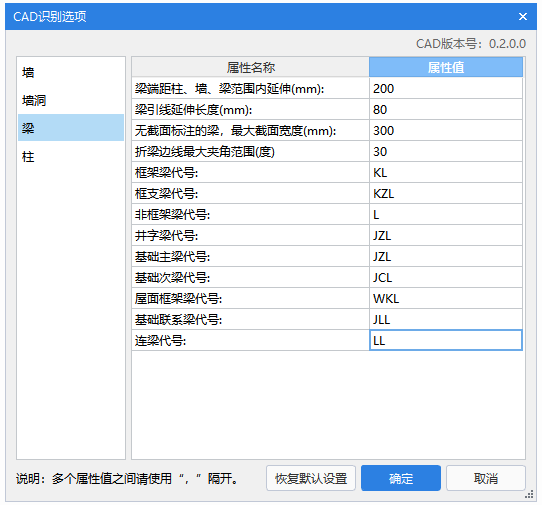对于构件名称中有‘LL’字符的,软件会默认识别为连梁。程序是根据“CAD识别选项”进行名称匹配的,用户也可以根据实际情况修改对应的匹配名称。